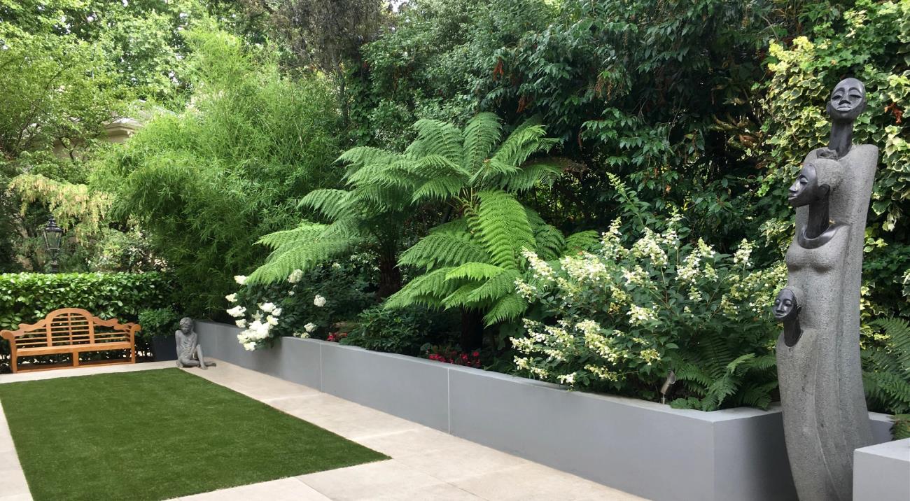 The beauty of using tree ferns here, was that their architectural form and large eye-catching leaves, would draw the eye, making the unkempt planting in the garden behind fade away, without blocking it completely.